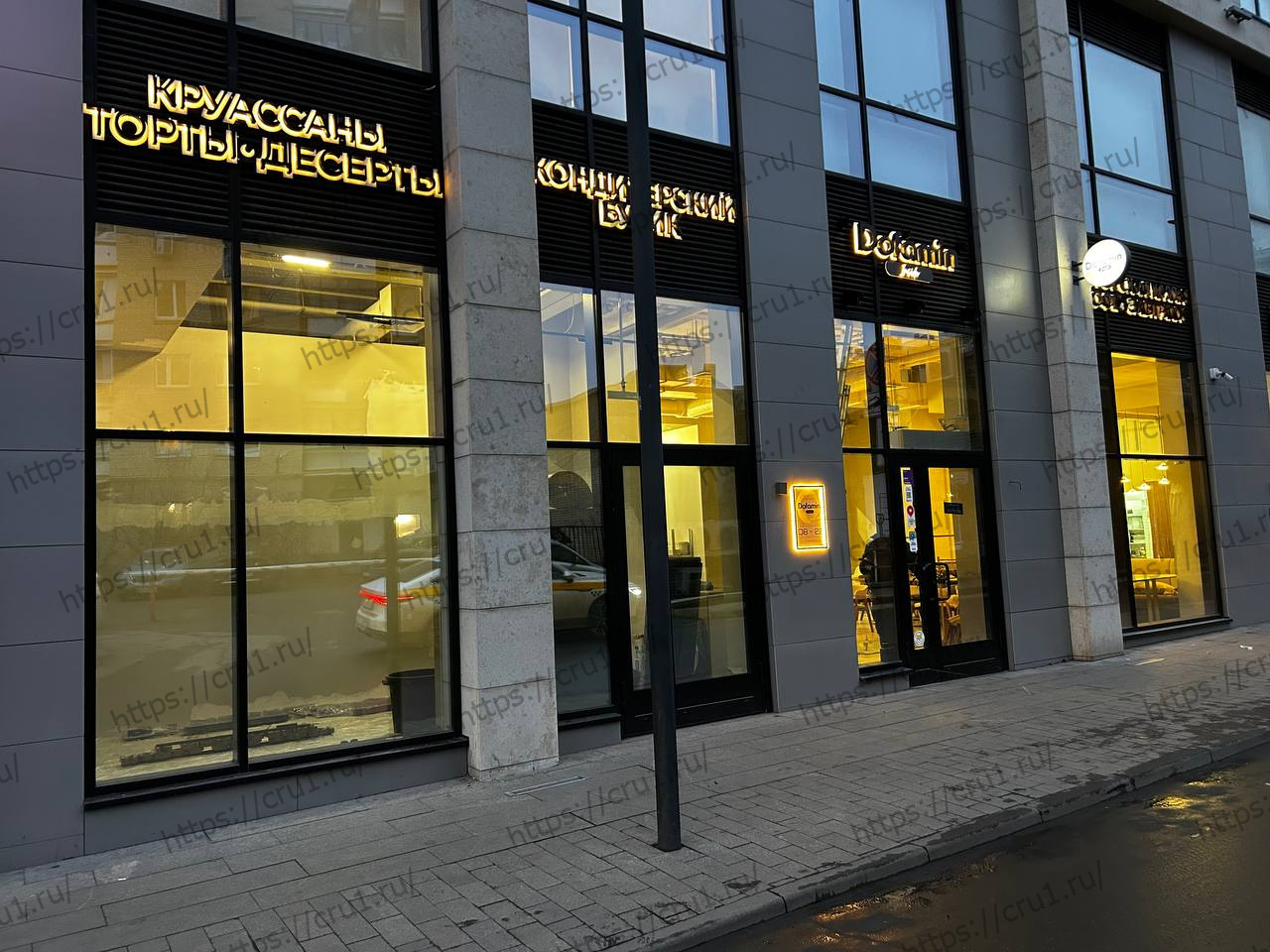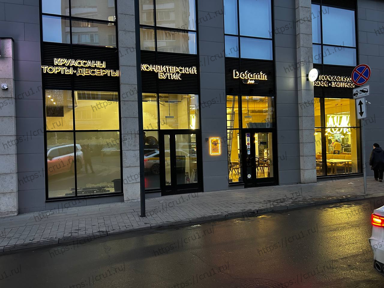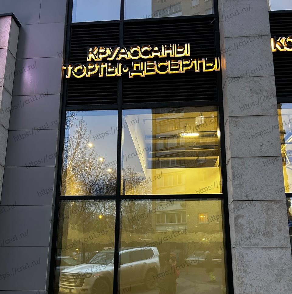 Итог превзошел ожидания. Вечером вывеска Dofamin превращается в световое чудо: черные объемные буквы с контражурной подсветкой отбрасывают мягкий золотистый ореол на стену, создавая эффект «свечения изнутри». Световой короб равномерно подсвечивает логотип бутика, не перебивая основную композицию, а дополняя ее. Теплый свет светодиодных кластеров вызывает ассоциации с ароматом свежей выпечки и домашним уютом — именно те эмоции, которые хочет передать бренд своим гостям. Днем конструкция выглядит минималистично и статусно: глубокий черный акрил переливается на солнце, а алюминиевый борт подчеркивает точность исполнения.